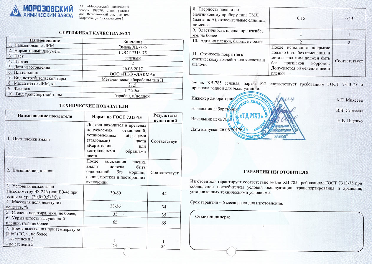 ХВ-785 является суспензией (дисперсной системой) химических порошковых красителей в растворе смолы хлорированной поливинилхлоридной, а также смолы алкидной в смеси органических летучих растворителей с добавлением пластификатора.